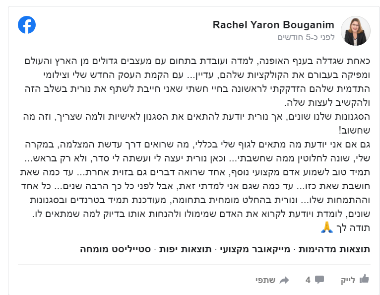 ולהיות רגועה שאת מעבירה את הסיפור שלך דרך הלבוש והתמונה בצורה אותנטית שמשקפת אותך ואת העסק שלך.